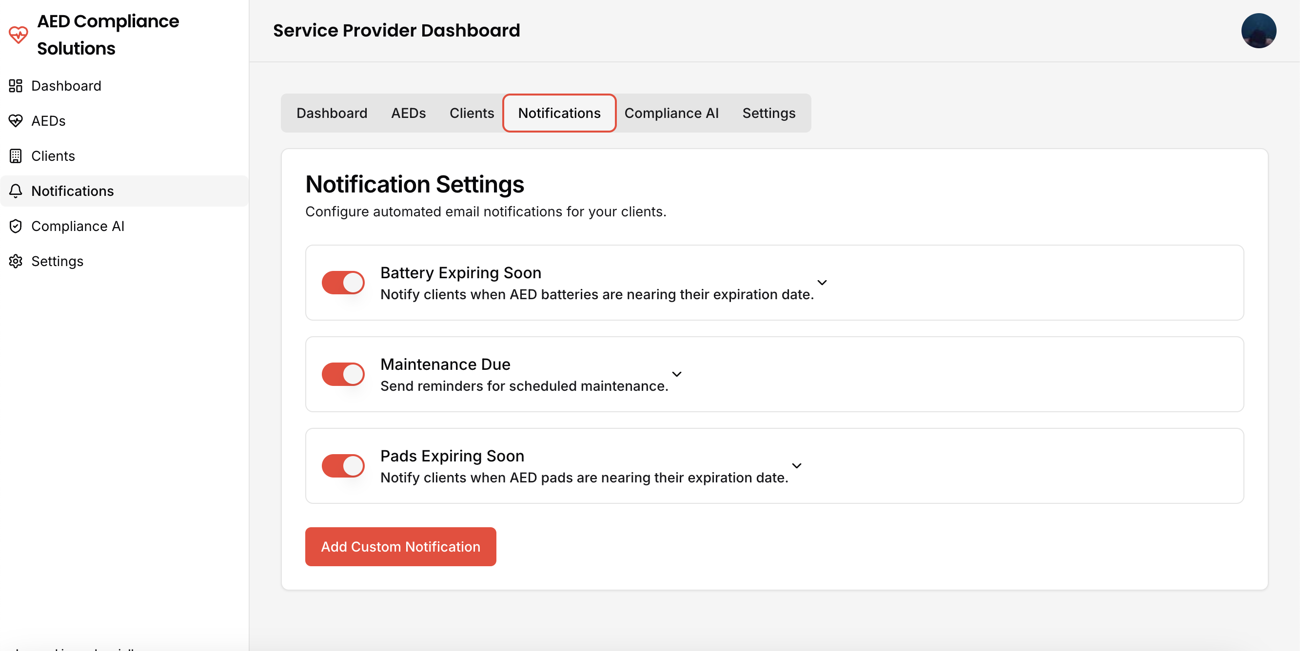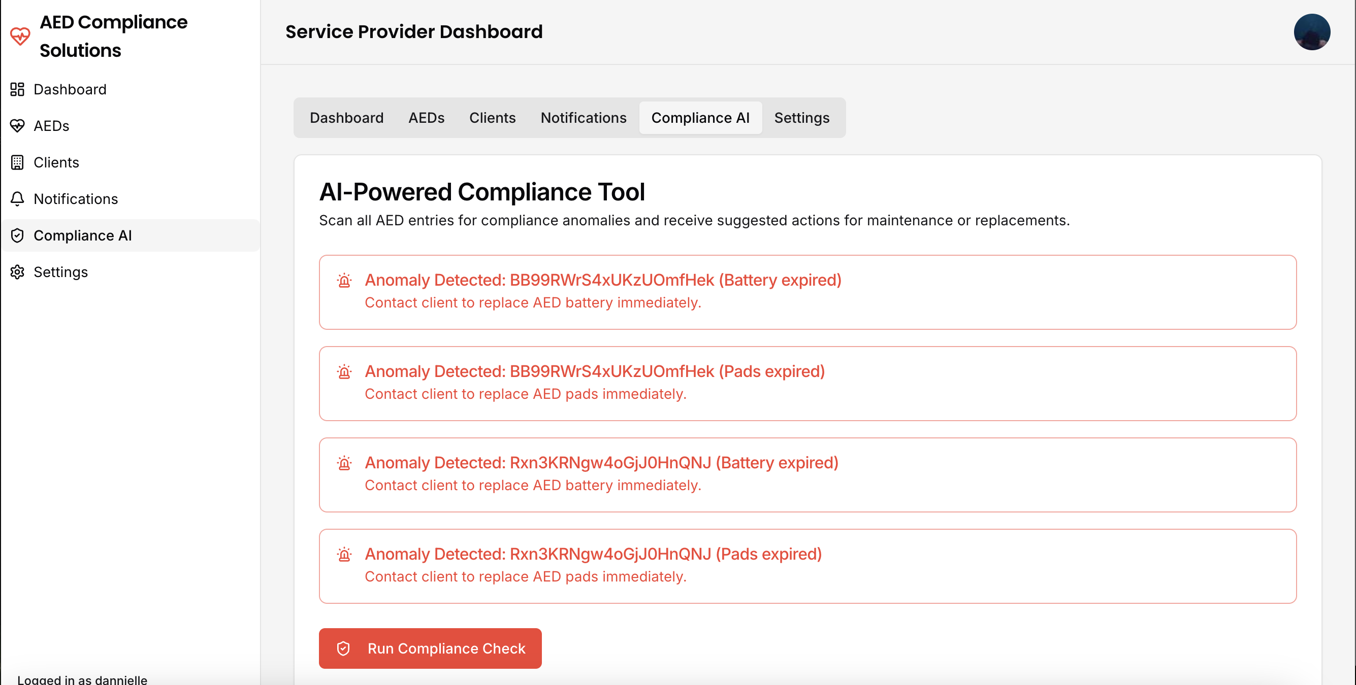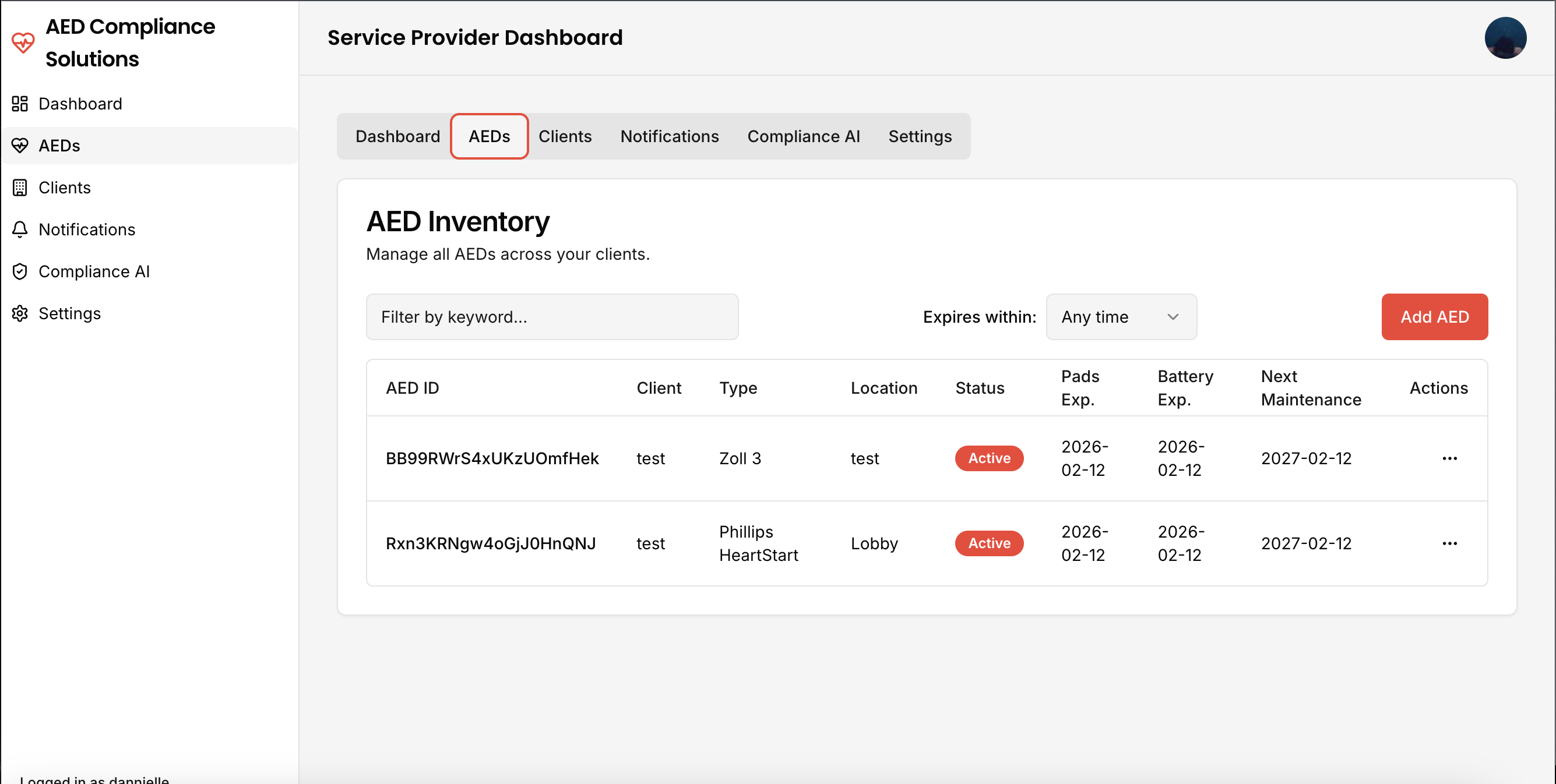 The all-in-one platform for service providers to track AED inventory, manage clients, and ensure compliance with AI-powered insights and automated notifications.